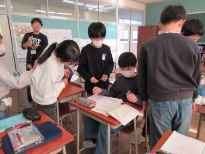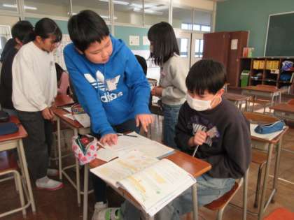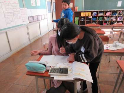 台形の面積の求め方について学んでいます。教えたり、教えられたり、子供たちは互いのことを思いやっています。