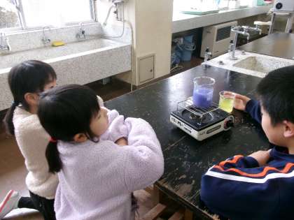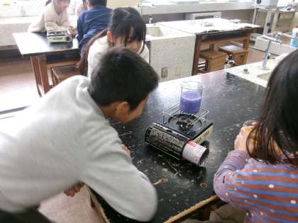 水のあたたまり方の学習をしています。水はどのようにあたたまっていくか、示温インクを使って調べました。色の変わり方を真剣に見ています。