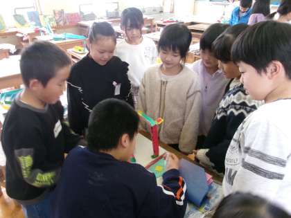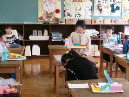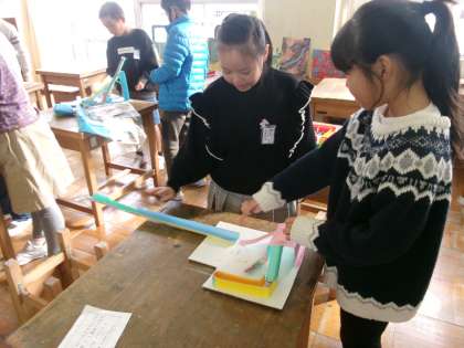 図画工作科では、「コロコロガーレ」の学習をしました。今日は、できた作品を紹介した後、できた作品で遊んでみました。子供たちは、みんなの工夫したコースに楽しみながらビー玉を転がしていました。