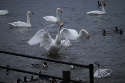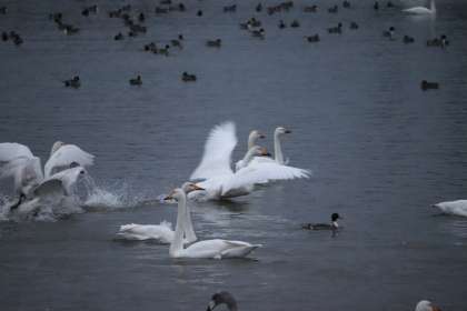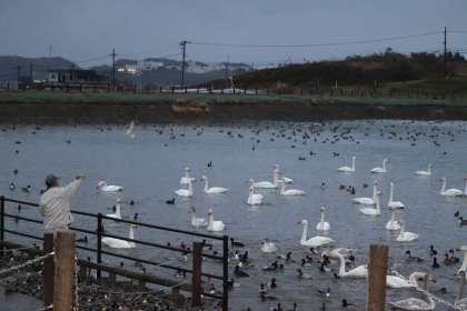 今朝の田尻池は雨模様ですが、たくさんの白鳥が見られました。飛来数は55羽でした。