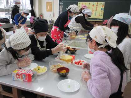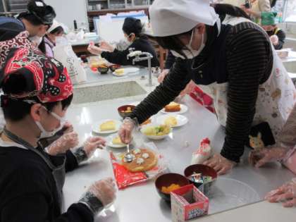 力を合わせて、ケーキのデコレーションに取り組んでいます。
