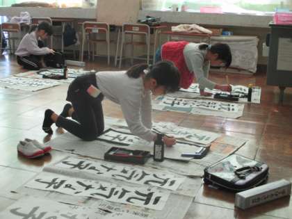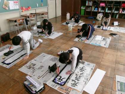 書き初め大会では、真剣な表情で「元気な子」と書きました。
