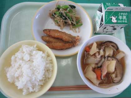 今日のメニューは、ご飯、わかさぎのフリッター、ごま浸し、豚肉の南蛮煮、牛乳でした。ご飯に、さくさくしたフリッターや野菜たっぷりの和え物、煮物がとてもよく合います。