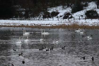今朝の田尻池は雨が降っていて土日に降った雪が少し残っています。飛来数は76羽でした。
