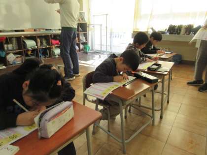 新しい漢字の練習に取り組んでいます。正しい書き順になるよう注意深く書いていました。