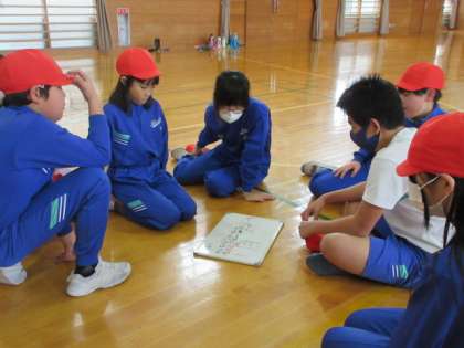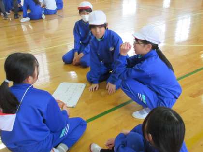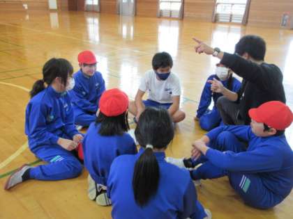 バスケットボールの学習です。ゲームをやってみて、どう動きを改善していくかについて見直しを図っています。
