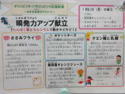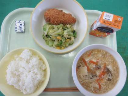 「瞬発力アップ献立」です。さくさくフライとすっきり和え物に、ふわふわかき玉汁がよく合いました。オレンジジュースも大人気です。