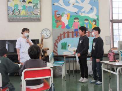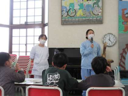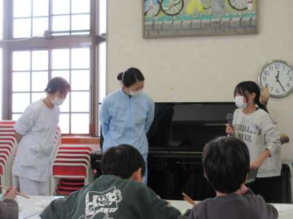 学校給食週間も最終日、調理員のお二人に池多っ子が日頃の感謝を伝えしました。