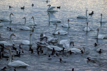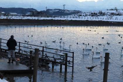 今朝の田尻池は晴れています。飛来数は60羽くらいでした。