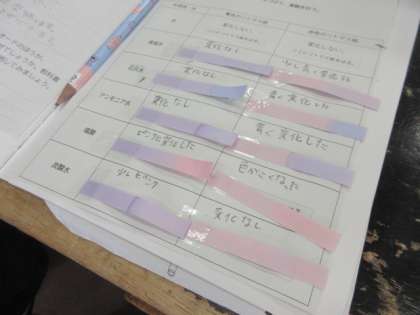 水溶液の性質を学びます。実験結果をきれいにまとめています。