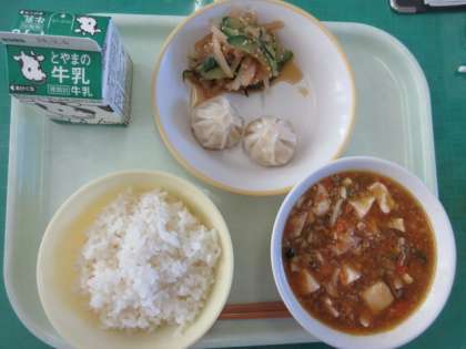 今日のメニューは、ご飯、えびパオツ、華風和え、麻婆豆腐、牛乳でした。麻婆豆腐には、細かく丁寧に切りそろえられた野菜が入っています。ピリ辛でおいしかったです。