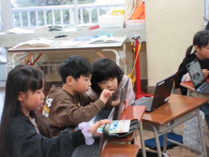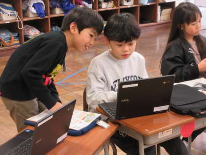 校内を探検し、すてきな顔を見つけました。自分のシートにその写真を貼り付けています。