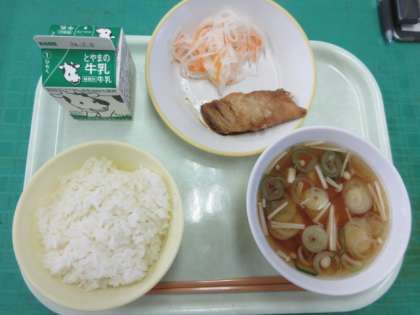 今日のメニューは、魚のかば焼き、なます、すまし汁、牛乳でした。なますは色鮮やかできれいです。和食のおいしさを味わいました。