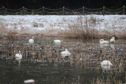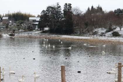 今朝の田尻池は雪が少し降っています。飛来数は76羽でした。