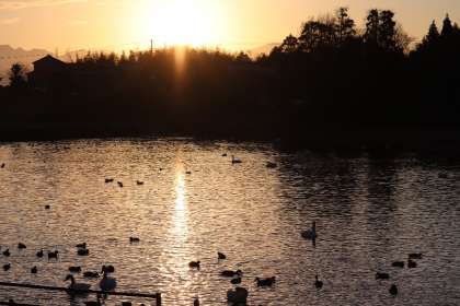 今朝の田尻池はよいお天気です。飛来数は85羽でした。