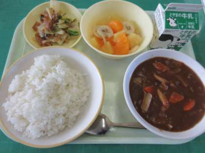 今日のメニューは、食べキリンハヤシライス、福神和え、フルーツミックス、牛乳でした。甘いハヤシライスにみんなにっこり、大満足の様子です。