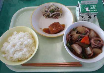 今日のメニューは、ごはん、牛乳、照り焼きチキン、ゆかり和え、里芋とイカの煮物でした。煮物は具材に味がしみこんでいてとてもおいしかったです。