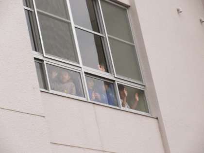 下級生が見送っています。