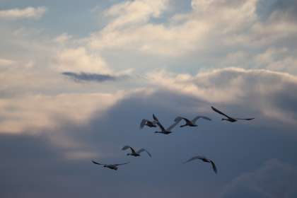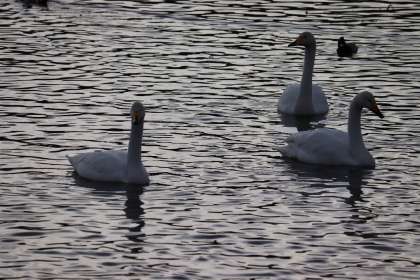 今朝の田尻池は晴れています。飛来数は68羽でした。たくさんの白鳥が飛び立っていきました。