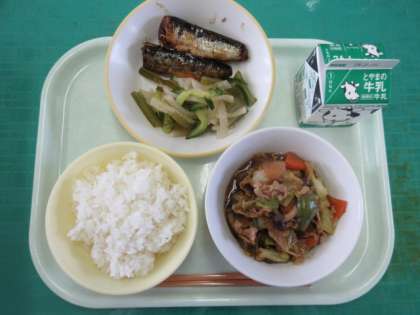今日のメニューは、ご飯、いわしの生姜味、茎わかめの酢の物、回鍋肉、牛乳でした。肉や野菜にしっかりとソースの味が絡んでいて、おいしかったです。酢の物はとてもさっぱりしていました。