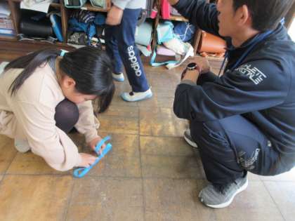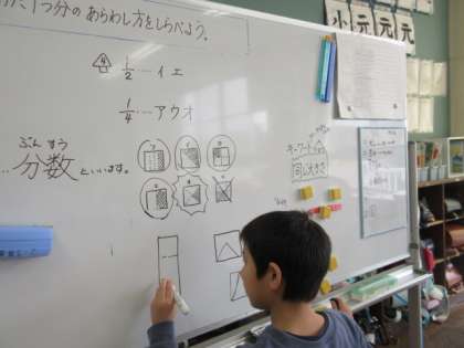 分数の学習で、実際にリボンを三等分にしています。
