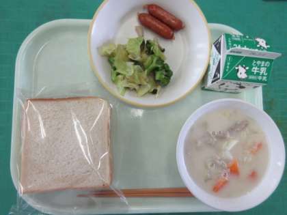 今日のメニューは、食パン、あらびきウインナー、ブロッコリーときのこのアヒージョ、米粉シチュー、牛乳でした。オリーブ油とにんにくの香りがアヒージョのおいしさを引き立てています。おしゃれな洋食メニューでした。