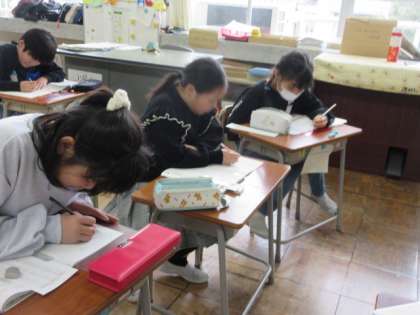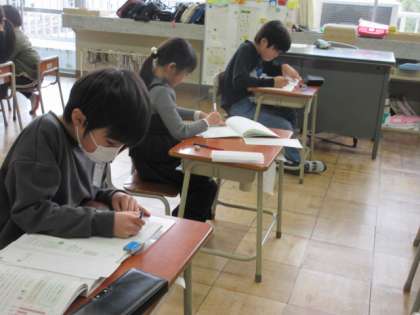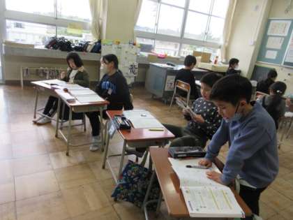 複式学級として、子供たちが自主的に学習するスタイルが身に付いています。先生が戻ったときには、「もうできたよ!」という声が聞かれました。
