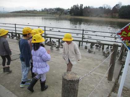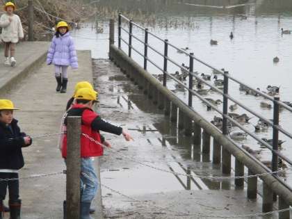 子供たちは、カモの動きや種類を楽しそうに見ています。