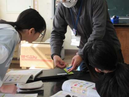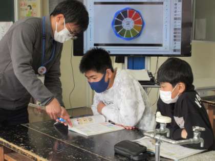提示された万能試験紙を興味深くのぞき込んでいます。