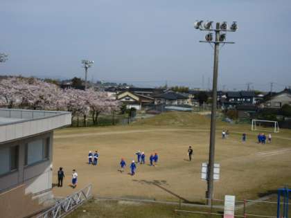 桜が満開の中、5・6年生が、徒競走の練習をしています。 みんな元気にがんばっています。
