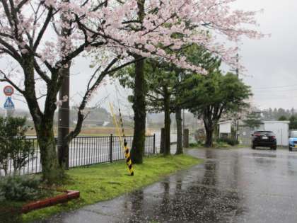 雨、そして強い風に打たれて、桜の花びらが少し散っています。 どんよりとした肌寒い朝です。