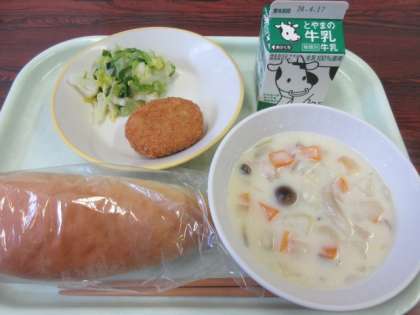 今日のメニューは、コッペパン、牛乳、豆とかぼちゃのコロッケ、ピクルス、クリームチャウダーです。