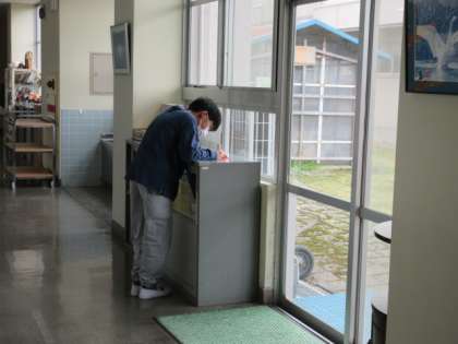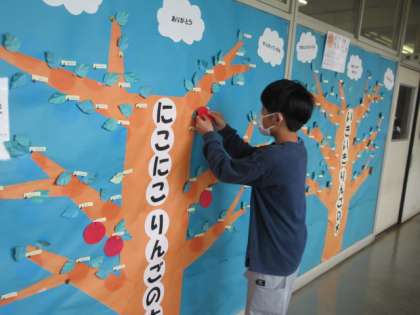 高学年の子供が、進んで友達のよいところを「りんごの実」に書いています。
