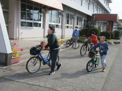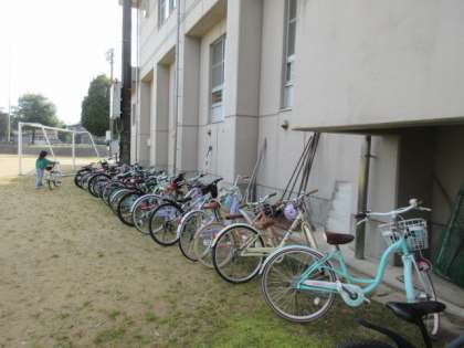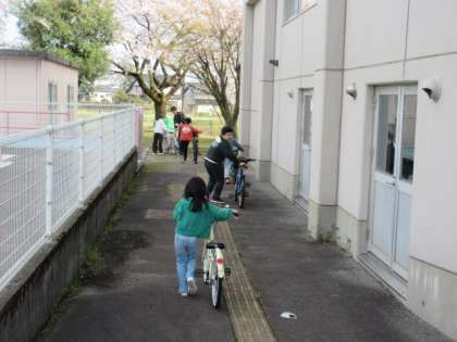 一人一人が自転車を移動させています。自転車について学ぶのは、3年生以上の子供たちです。