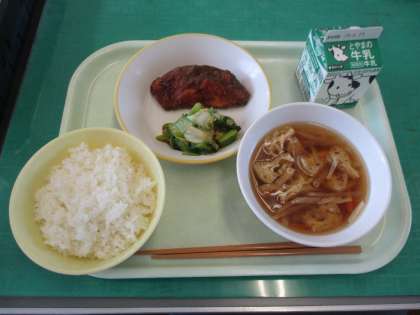今日のメニューは、ごはん、牛乳、魚の竜田揚げ、おひたし、沢煮椀です。あつあつの沢煮椀は、具に味がしみていておいしくいただきました。