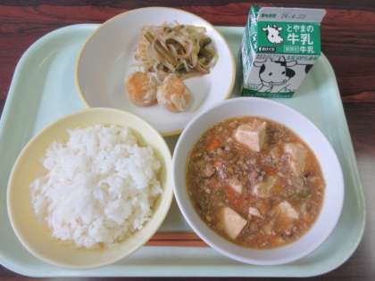 今日のメニューは、ごはん、牛乳、にんじんシューマイ、茎わかめのチョナムル、マーボー豆腐です。