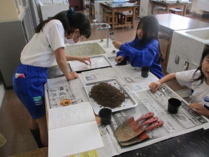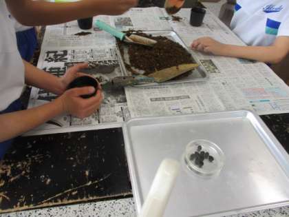ヘチマの種を植えているところです。柔らかく土を入れるため、容器を優しくトントンとゆすっています。どんな育ち方をするでしょうか。