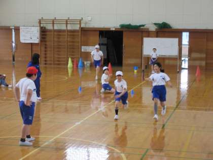 体育の時間にバトンの渡し方を練習しています。