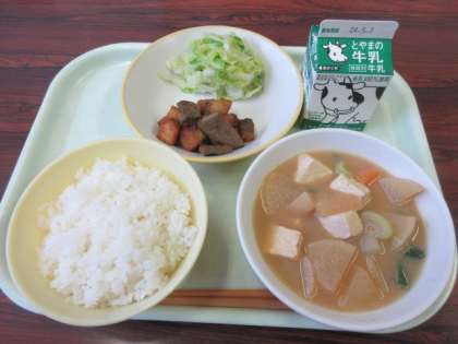 今日のメニューは、ごはん、牛乳、魚とレバーの揚げからめ、ごまけんちんです。