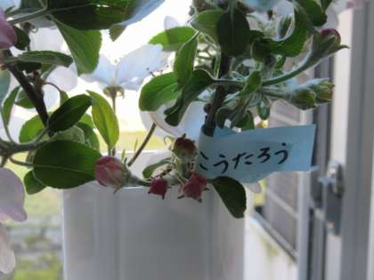 りんご農家さんからいただいたりんごの花が、廊下を彩っています。