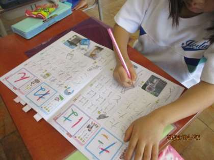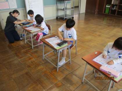 ひらがなの学習をしています。ていねいに空書き、指書き、なぞり書きを行っています。やる気いっぱいの一年生です。