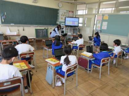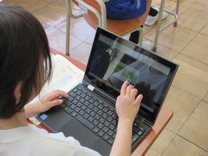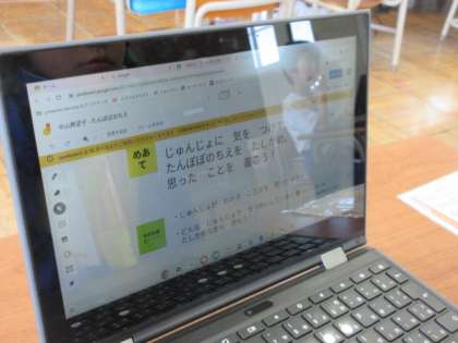 国語の時間に教科書を読みながら、たんぽぽの知恵はいくつあるのか、どんな知恵なのかを見つけています。クロムブックに書き込んでいます。