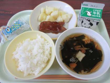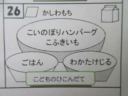 季節感ある「若竹汁」、こいのぼりの形をした「こいのぼりハンバーグ」、デザートには「柏餅」が付いています。