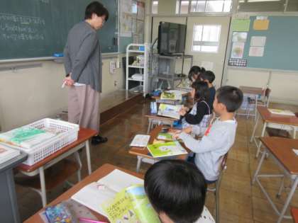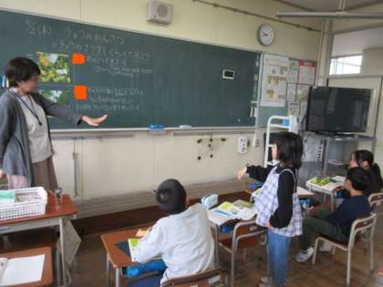 理科の時間に、花畑とキャベツ畑のチョウの様子を調べています。