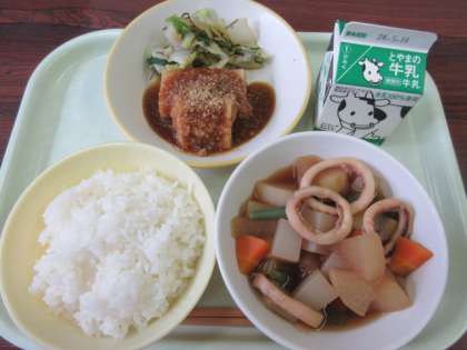 今日のメニューは、ごはん、牛乳、揚げ出し豆腐のごまだれかけ、昆布和え、いかと野菜の煮物です。