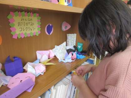 昼休みに下学年の子供たちは、図書室で折り紙を折っていました。