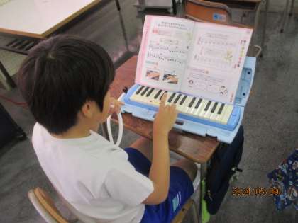鍵盤ハーモニカの運指を練習しています。4年生が3年生に教える場面も見られました。運動会の歌の練習もはりきってがんばっています。