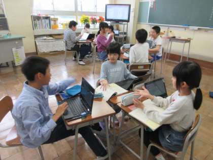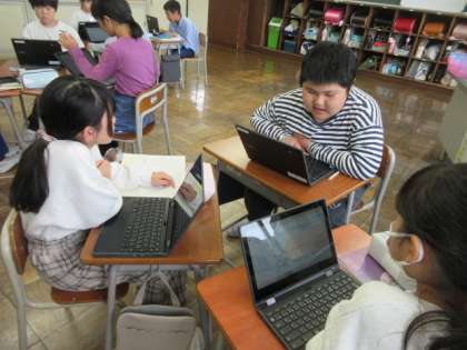 国語の時間、友達にインタビューしたことを、さらに別の友達に伝えています。