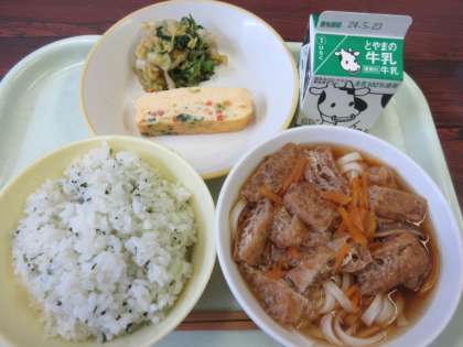 今日のメニューは、菜めし、牛乳、千草焼き、おひたし、かやくうどんです。
