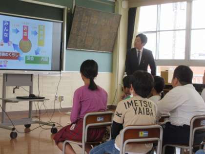 租税教室がありました。県の法人会の方に講師になっていただき、税金の仕組みや税金なかった場合に起こることなどを分かりやすく説明していただきました。